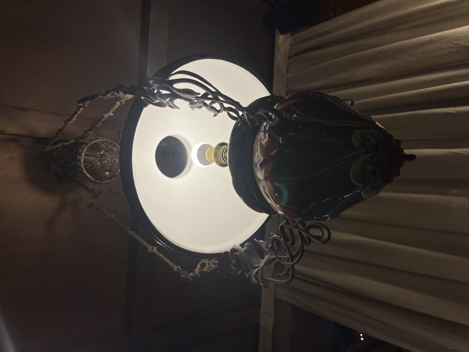 An ornate chandelier hangs from a ceiling. It features a round, white shade with a circular cutout in the center revealing a light bulb. The shade is surrounded by intricate metalwork. A green, bulbous glass fixture is suspended alongside the shade. The background includes a wall with visible wood paneling on the left and a curtain to the right.
