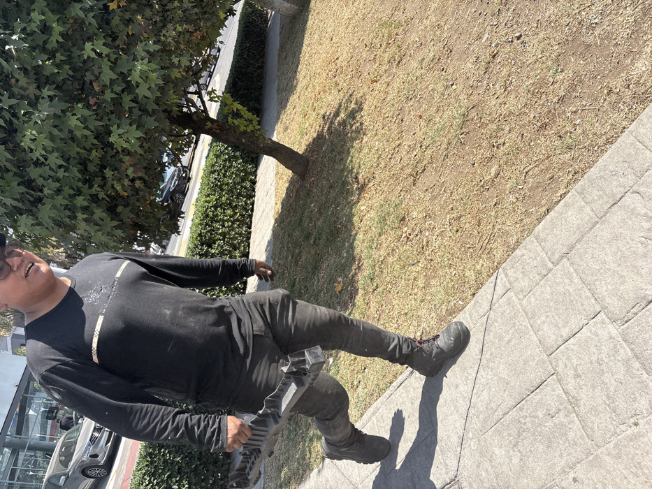A man stands on a concrete sidewalk next to a patch of dry, brown grass. He's wearing all black: a long-sleeved shirt, pants, and work boots. He's holding a large, gray plastic object with a complex, geometric design. Behind him are green bushes and a tree. In the background, cars are visible, suggesting an urban or suburban setting. The image is taken at an angle, making the ground appear tilted.