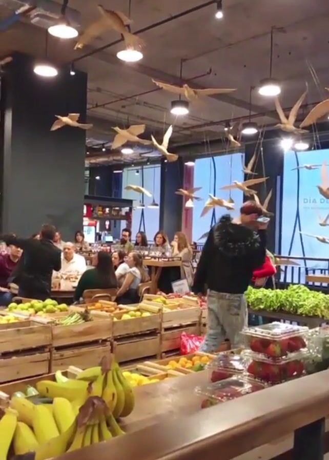 The camera pans across an indoor market or food hall. There are many wooden crates overflowing with fresh produce such as bananas, avocados, apples, strawberries, and lettuce. Overhead, numerous wooden bird sculptures hang suspended from the ceiling, illuminated by pendant lights. Several tables are occupied by seated customers who are eating and talking. One man in a black coat appears to be giving a presentation or speaking to the group at one of the tables. A poster with the words "DIA DE..." is visible in the background.