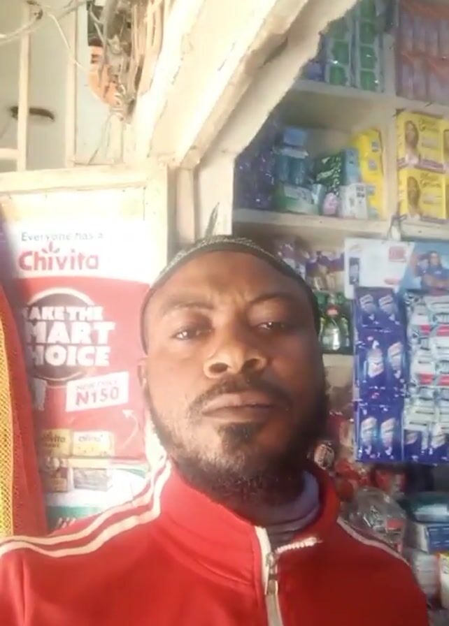 man taking a selfie in what appears to be a small store. The man has a beard and is wearing a red jacket with white stripes on the shoulders and a cap. Behind him, shelves are stocked with various products, including food items, and on the left, there is an advertisement poster. Two other men are visible in the background. The video is slightly shaky.