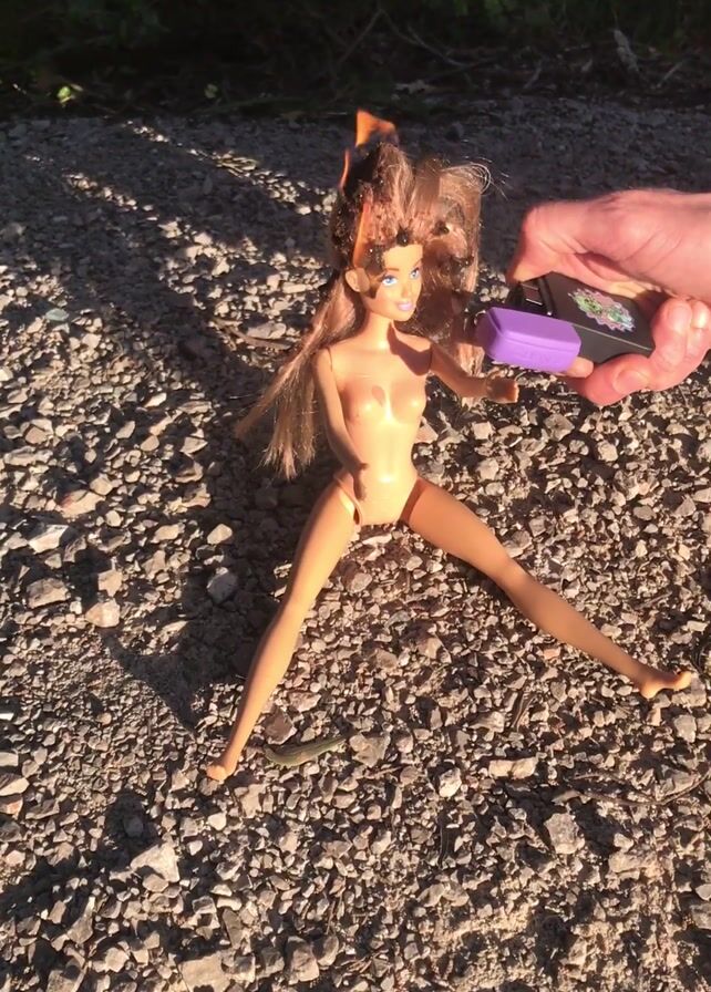A nude Barbie doll lies on a gravel path in sunlight, legs splayed. A man's hand holds a purple lighter near the doll's hair, which appears singed. The man is then shown kneeling, wearing a cap, glasses, and casual clothing. The background includes green vegetation.