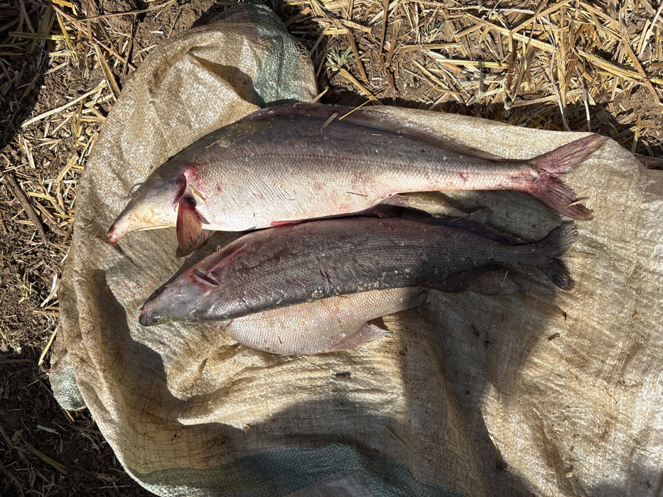 Three deceased fish are depicted resting on a light-colored, creased woven polypropylene sack. Two larger fish, approximately 60-70 cm in length, are prominently displayed. One is dark grey/black, and the other is lighter grey/silver with reddish gill areas and a bifurcated tail fin, displaying several small dry plant fragments adhering to its body. A third, smaller, light-colored fish is partially visible beneath the darker large fish. The sack lies on dry, exposed earth with scattered dry straw and plant debris. The scene is illuminated by strong overhead sunlight, casting distinct shadows. This scene is located in Kokani North, Nigeria.