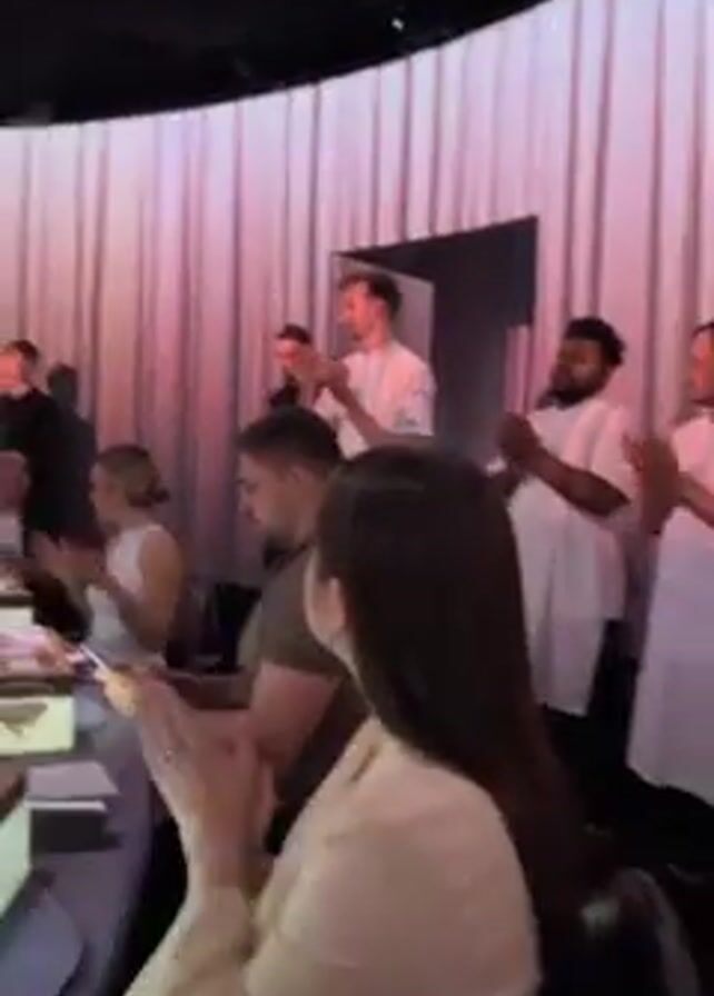 A group of people are sitting around a large, round table in what appears to be a restaurant or dining event. Several individuals in chef's whites stand among them, likely involved in the food service. The table is set with dishes and glasses, and a rectangular decorative object is present in front of several attendees. A man in a chef's coat is addressing the group while the others are applauding. The room has a modern design with a curved wall decorated with vertical strips or panels of light pink hue. The ceiling is black. The camera slowly zooms out.