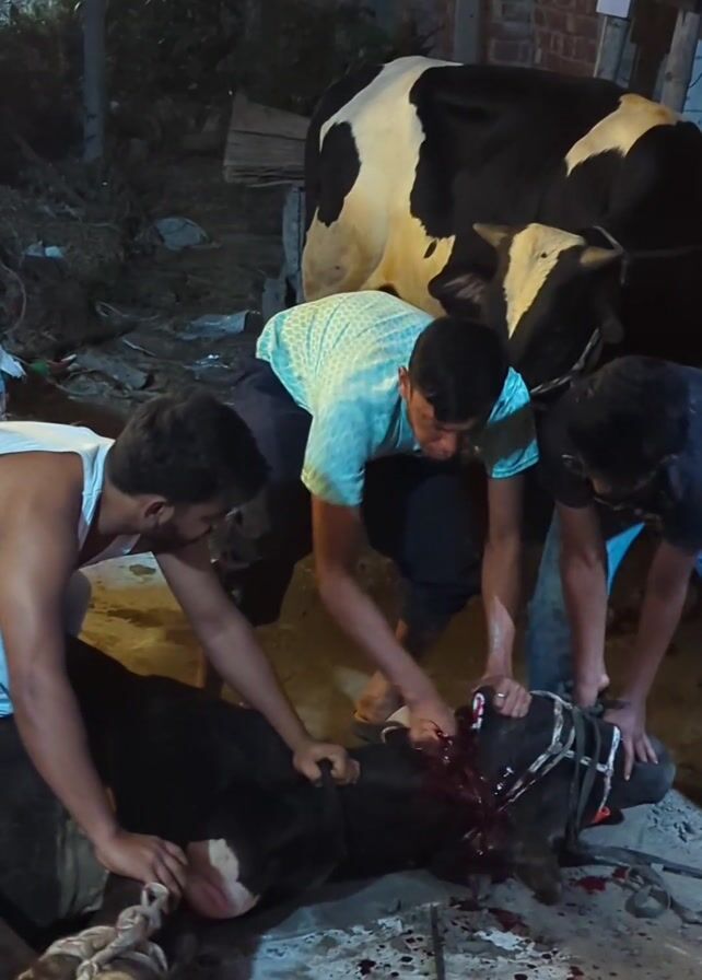 three men slaughtering a black and white cow. The cow is on the ground with blood pouring from its neck. The men are standing around the cow, holding it down and cutting its throat. There is another cow standing nearby. The ground is dirty. The video is graphic and disturbing.