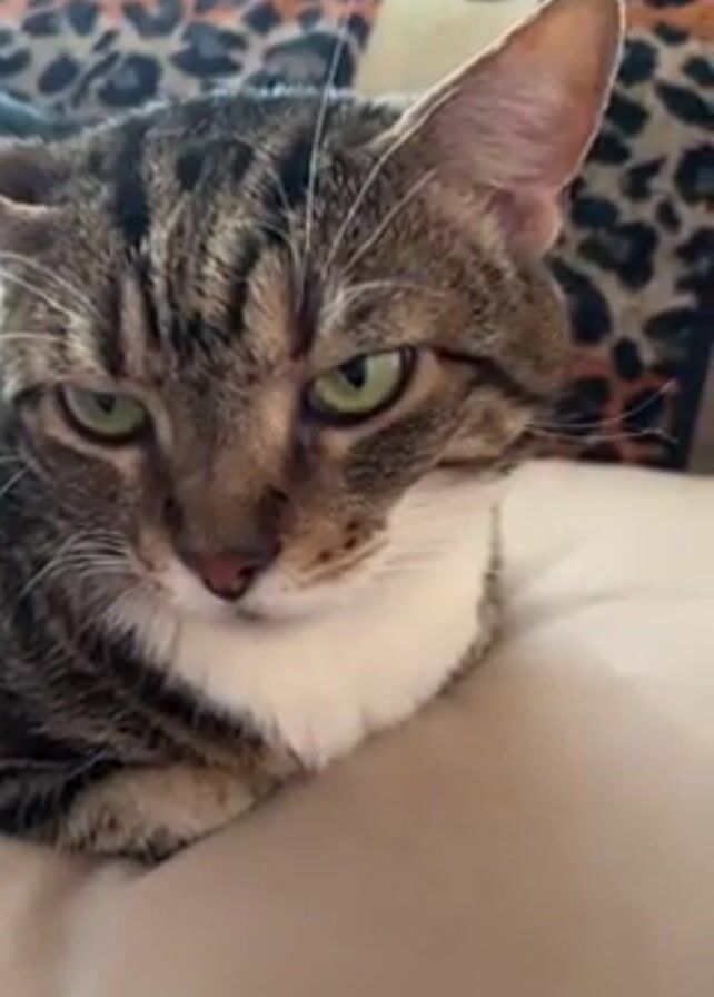 A close-up video shows a brown tabby cat with a white chest lying on a beige pillow