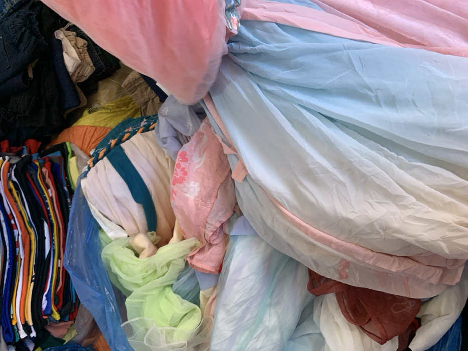 The image displays an indoor scene dominated by a large, disorganized accumulation of diverse textile goods