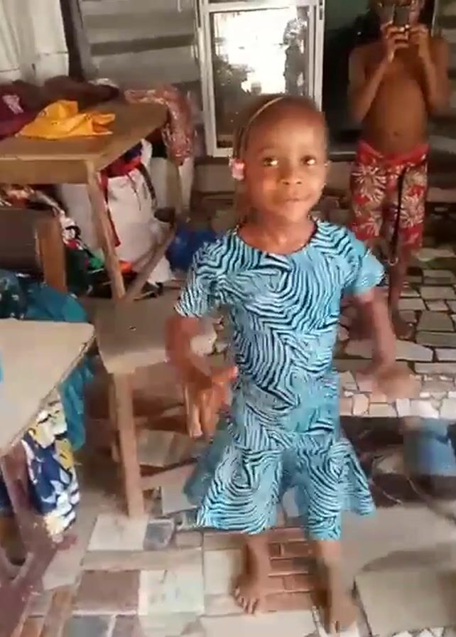 A young girl in a blue and black patterned outfit is dancing in front of the camera