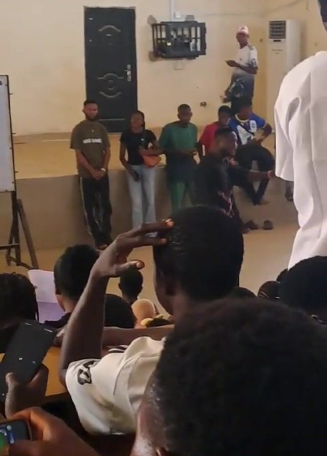 The video depicts a classroom setting with multiple people present. A group of individuals stand on a slightly elevated platform at the front, while the rest of the people are seated in what appears to be a lecture hall. Some individuals on the platform are gesturing, possibly speaking or performing. Those in the audience are watching, and a few have their phones out, some seemingly recording. The room is brightly lit with a white wall, a door, and a whiteboard visible in the background.