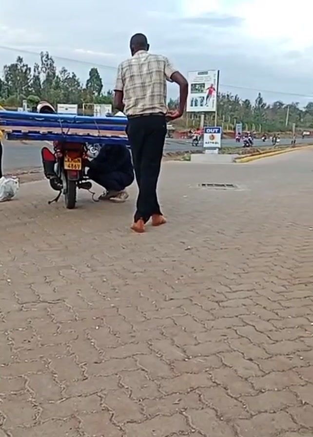 four people near a motorcycle parked on a brick-paved area. The motorcycle has blue and white materials strapped to it. One person, dressed in a plaid shirt and black pants, walks away from the motorcycle. Another person crouches by the motorcycle, seemingly working on it. A third person, wearing a beige shirt and pants, stands with their hands on their hips, watching. A fourth person, in a yellow shirt and black pants, stands near the motorcycle holding a white plastic bag. The background includes a road with vehicles, trees, and signs, including one that says "OUT".