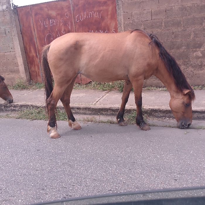 This image captures a street scene in Juan Griego, Venezuela. A light brown horse, characterized by a dark brown mane, tail, and lower leg points, stands centrally on an asphalt road. Its head is lowered, actively grazing on sparse green vegetation growing along the edge of a concrete sidewalk. A silver ring is visible through the horse's left nostril. To the far left, a portion of a second horse's dark brown head is partially visible near the sidewalk. The background consists of a boundary wall: a gray concrete block section on the left transitions into a rusted, corrugated metal gate or panel on the right. White graffiti-style text is visible on this metal surface, prominently reading "Yulennys <3 Eudimar," with additional, partially legible words like "Ola" and "Amanda" underneath. The scene is illuminated by ambient daylight.