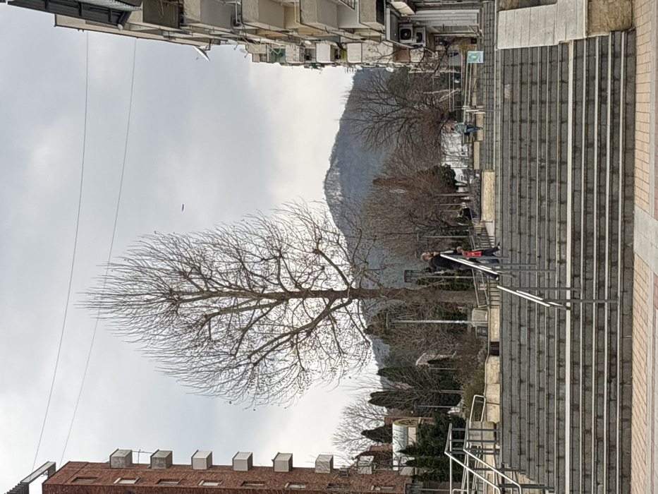 The image depicts an outdoor urban environment in Gorna Oryahovitsa, Bulgaria, under an overcast sky. A wide, multi-tiered stone staircase with silver metal handrails occupies the foreground and extends into the midground. On the far left, a multi-story brick building with multiple identical protruding square balconies is visible. Centrally, a tall, leafless deciduous tree stands prominently, its branches forming a dense, tapering crown. To the right of the tree and above the staircase, a large, partially forested mountain is visible in the background under a uniformly grey sky. A small, elongated purple object is discernible in the upper-center sky. In the midground, a bearded man wearing a dark jacket is walking downwards on a paved path parallel to the staircase, holding a red object. A small child, wearing red and largely obscured, walks beside him. Further right and slightly behind, another individual in a light-colored jacket is ascending a set of steps or a ramp. Various other bare trees and some evergreen shrubs are scattered across the scene, particularly to the left of the central tree, where a distinct building with an arched entrance is partially visible. On the far right, a multi-story building with a lighter facade features external air conditioning units and a white satellite dish. The overall scene suggests late autumn, winter, or early spring.