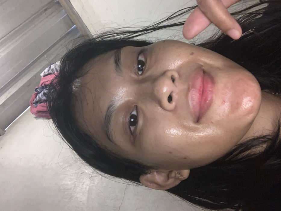 A selfie shows a woman with brown skin and dark hair. Her face is shiny, possibly due to oil or moisturizer. Her lips are full and pink, and her eyes are brown. A finger is visible in the upper right corner. She has an earring in her left ear, and a patterned cloth is visible on the left side near her hair. The background is blurry and includes a ceiling.