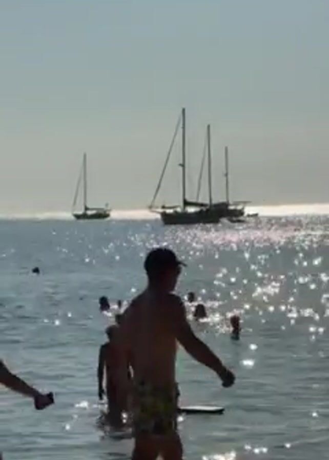 beach scene on a sunny day. Several people are swimming in the water, which is shimmering with reflected sunlight. Two sailboats are visible on the horizon. Two shirtless men in swim trunks walk along the beach in the foreground. The scene is silhouetted against the bright sky and water.