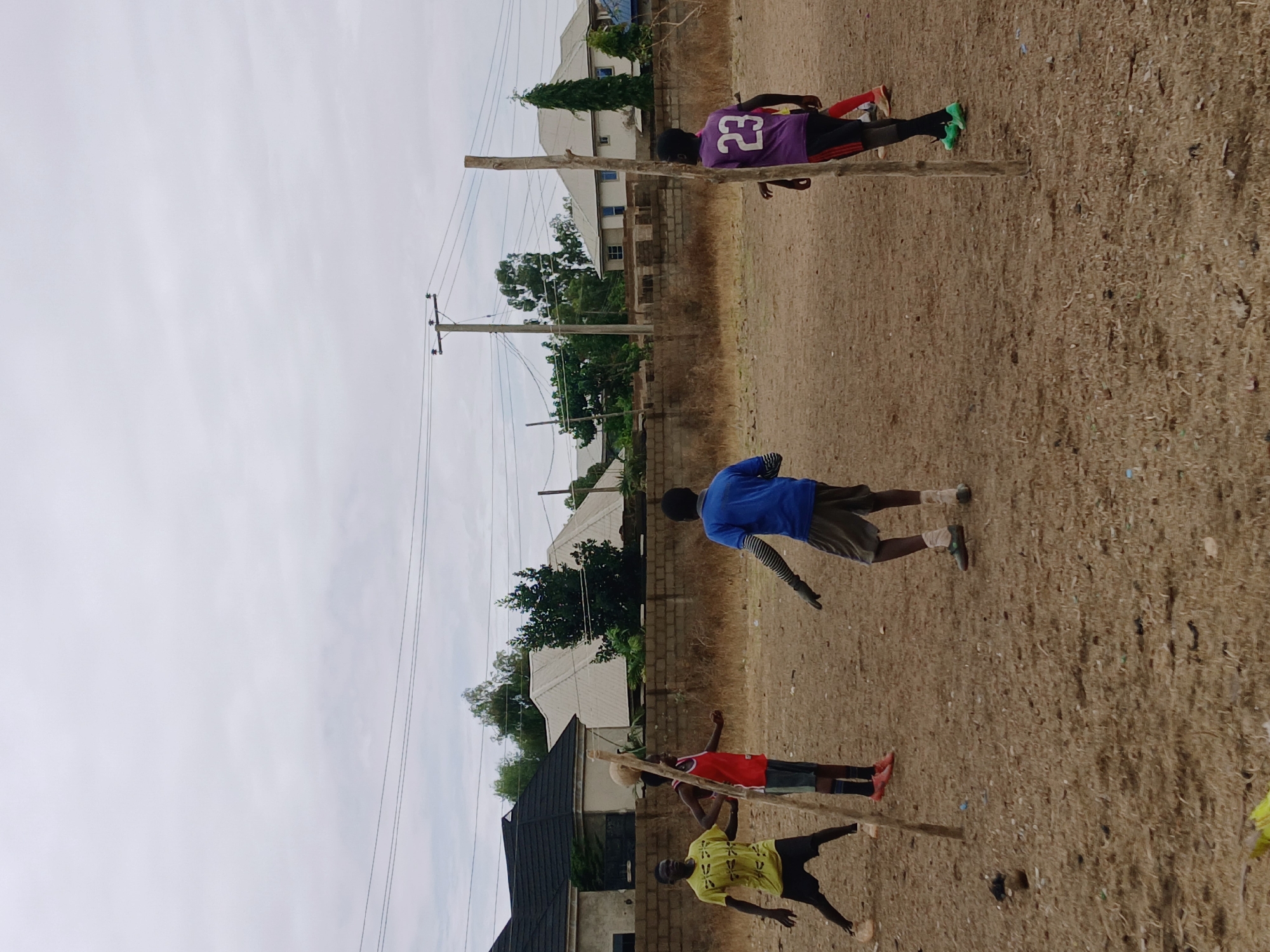 four people in a dusty, outdoor location in Kitwe, Zambia. The ground is covered in dry vegetation and bare earth. In the background, there are several buildings, trees, and utility poles. Four people are involved. One is wearing a purple jersey with the number "23" on the back. Another wears a blue shirt, dark shorts, and gloves. A third person wears a yellow shirt with a pattern and black shorts, and a fourth wears a red shirt. They appear to be playing some kind of game with upright wooden sticks as goal posts. One figure seems to be kicking a ball. The interaction appears to involve some informal game or sport.