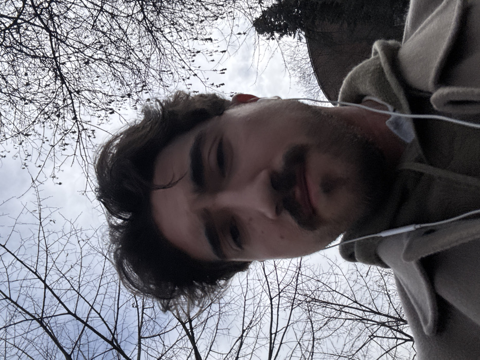 A man is depicted in a close-up, upward-angled selfie, looking directly into the camera. He has dark, wavy, medium-length hair and a dark mustache and beard. White wired earphones are inserted into both ears, with the connecting wires visible against his neck and chest. He is wearing a green or khaki hooded sweatshirt beneath a light beige or tan overcoat. The background consists primarily of a cloudy, overcast sky and numerous bare tree branches, suggesting a dormant season. To the far right, a dark, curved architectural structure, possibly constructed from brick or stone, is partially visible behind a dark evergreen tree. The scene is located in Sofia, Bulgaria.