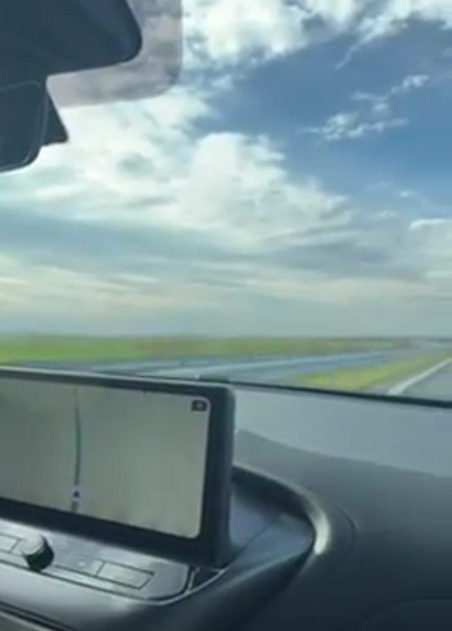 The view from inside a vehicle shows the road ahead through the windshield. The sky is blue with scattered clouds, and the flat landscape on either side of the road is predominantly green. A navigation screen is visible on the dashboard, displaying a map. The car is moving, indicated by the changing view of the road. Another vehicle can be seen in the distance on the same road.