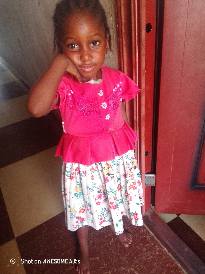 A young, dark-skinned girl in a pink top and floral skirt stands near a red door. The top features decorative lace and buttons, while the skirt is white with a colorful floral pattern. She has braids and is barefoot on a checkered floor. The girl rests her left hand on her cheek, creating a thoughtful pose. A watermark indicating the image was taken with an "AWESOME A05s" phone is visible in the lower left corner.