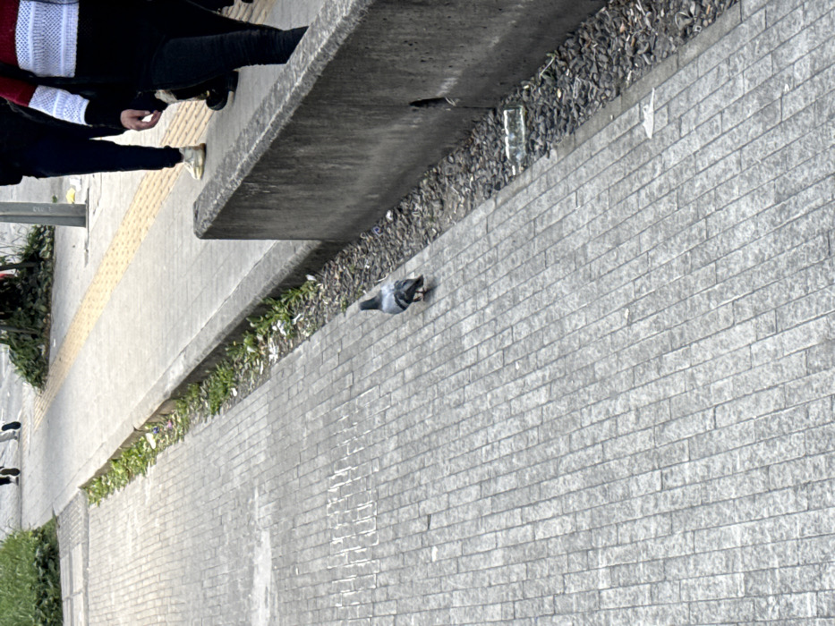 A ground-level, rotated shot shows a paved walkway with a ledge at the top. Two people stand at the walkway’s edge, and a pigeon is pecking at something on the walkway. The paving is a light gray brick, and green foliage runs along the walkway. The ledge is gray, and small stones are visible along its edge.