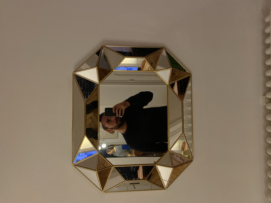 A mirror hangs on a white wall. It has an octagonal shape with triangular designs near its edges. The mirror reflects a man wearing a black shirt, holding a phone, presumably taking the picture. A glimpse of a person with blonde hair and a blue shirt is also visible in the mirror's background, suggesting someone else is present in the room. To the right of the mirror, a white radiator is visible.