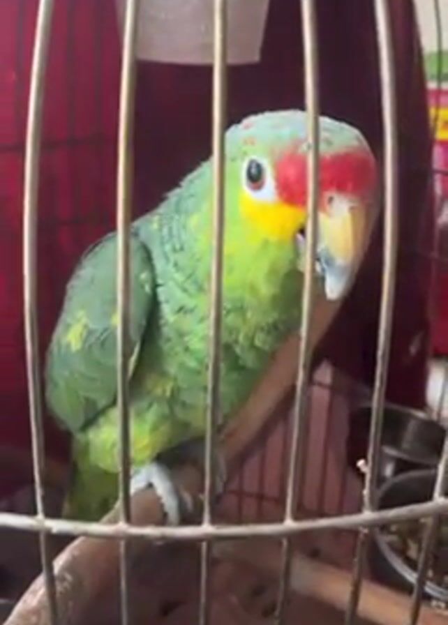 green parrot with a red forehead and yellow face sitting inside a metal cage