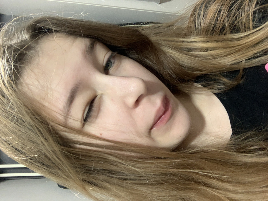 A close-up portrait displays a young individual, likely female, with light brown hair, fair skin, and a visible mole on the upper left cheek (viewer's right). The subject's left eye (viewer's right) is closed in a wink, while the right eye (viewer's left) is partially open, looking downwards. Her lips are slightly parted, exhibiting a glossy appearance on the lower lip. She wears a dark-colored garment, possibly a black shirt. The background is an indoor, indistinct environment with muted colors, featuring a vertical light-colored strip on the far right. The scene is located in the Vozdovac Urban Municipality, Serbia.