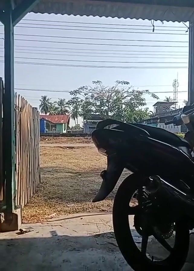 stationary motorcycle parked under the shelter of a building with a corrugated iron roof. The motorcycle, silhouetted against the daylight, is partially obscured by a display case advertising a beverage. Outside the shelter, there's a view of a grassy field and some buildings, including a house with a red roof and coconut trees, all under a clear sky. Power lines stretch across the horizon. The side of a bamboo fence is visible on the left. The time of day appears to be morning, based on the lighting.
