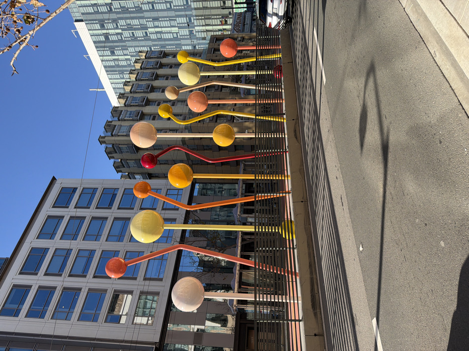 - "A street-level view capturing a row of spherical sculptures atop colorful, curving rods that are positioned against the backdrop of modern buildings under a blue sky" by FM-1neqH3, licensed under CC BY 4.0