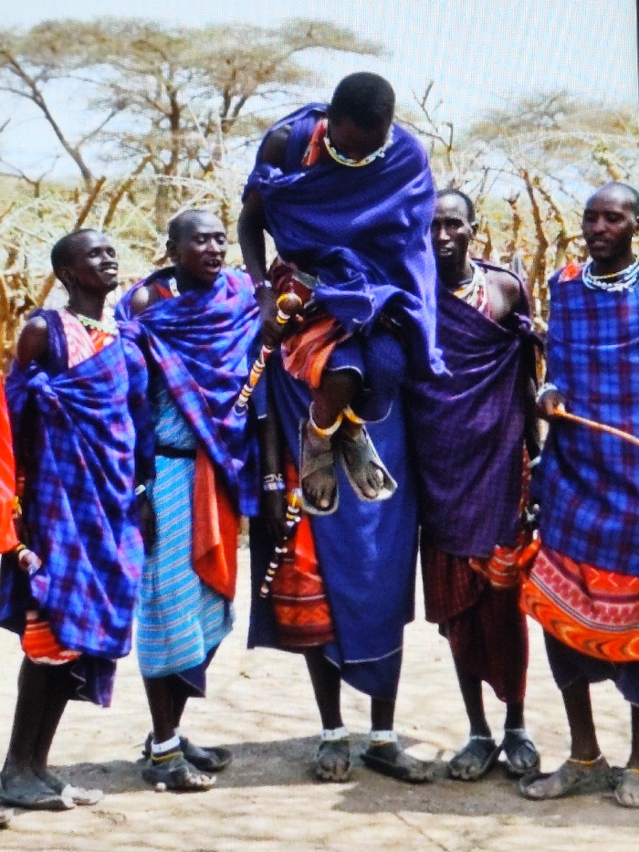 Five adult males are depicted standing and performing outdoors in a dry, open environment within the city of Dodoma, Tanzania. The central figure, positioned mid-frame, is captured airborne, executing a high vertical jump. He is dressed in a dark blue fabric wrap over an orange and red patterned lower garment and wears dark sandals along with beaded necklaces and anklets. To his immediate left, a male figure wearing a blue plaid fabric wrap over a light blue and white striped lower garment looks upwards, his mouth slightly ajar. To the far left, another male figure in a blue plaid fabric wrap with a red lower garment also looks upwards. To the right of the jumping figure, two additional male figures stand. One is clad in a deep purple fabric wrap over a dark red lower garment. The other, on the far right, wears a blue plaid fabric wrap over an orange and red patterned lower section and holds a slender wooden stick in his right hand. All individuals wear sandals and various beaded ornaments, including necklaces, bracelets, and anklets. The ground consists of light-colored, dry earth. In the background, sparse trees with light-colored bark and branches are visible under a bright, hazy sky.