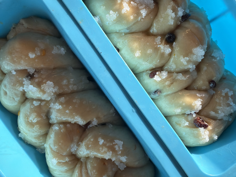 - "The image presents a close-up, angled view of two unbaked or proofed braided dough loaves, each contained within a distinct turquoise-blue silicone loaf mold" by FM-1FhX33, licensed under CC BY 4.0