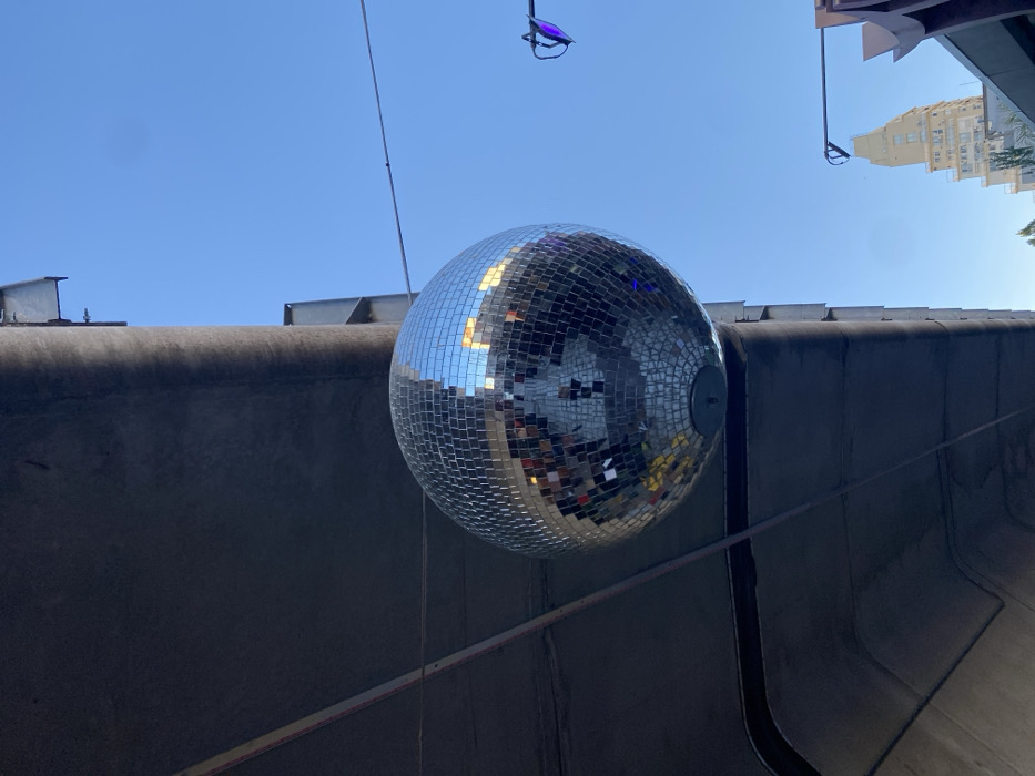 - "A large disco ball hangs suspended against a bright blue sky, positioned next to a gray concrete structure with metallic elements" by FM-wG85Y2, licensed under CC BY 4.0