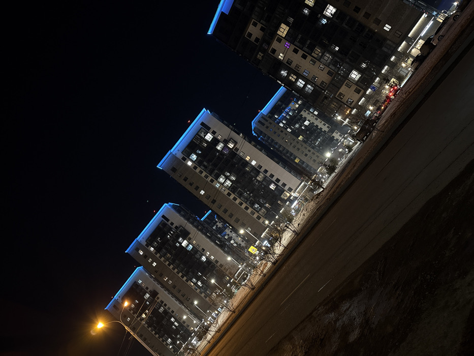 This forensic description details an urban nighttime scene in Krasnoyarsk, Russia, depicting a modern residential area during winter. The image is significantly tilted diagonally upwards to the right. The scene features at least five multi-story, high-rise residential buildings. These structures are characterized by light-colored facades, dark-paneled sections (likely windows and balconies), and distinctive bright blue LED strip lighting along their rooftop perimeters. Numerous windows across all visible buildings are illuminated, indicating active occupancy. A multi-lane asphalt road runs diagonally across the lower and mid-sections of the image, appearing dark and possibly wet or icy in areas. White lane markings are discernible. The roadside and areas between buildings are covered with a thin layer of snow, suggesting winter conditions. Sparse, bare deciduous trees are visible, also partially dusted with snow. Artificial illumination dominates the scene. Streetlights with a warm, yellowish glow line the road, casting light onto the ground and lower building levels. The blue rooftop LEDs provide distinct architectural lighting. Additionally, headlights and taillights from several vehicles are visible on the road and in parking areas near the buildings. No individuals are clearly identifiable. A yellow street sign is partially visible in the midground near the road. The sky above is dark and clear.