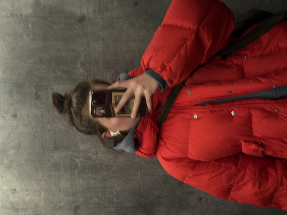 A person wearing a red puffer jacket is shown from a slightly overhead angle, taking a selfie with a phone