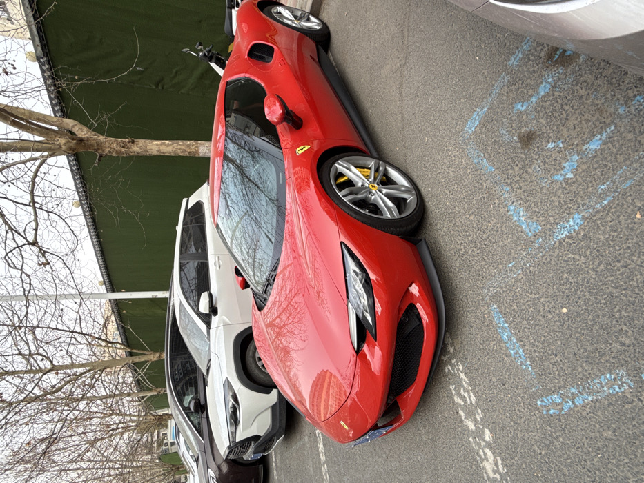 The image captures an outdoor parking area in Chaoyang District, China. A red Ferrari 296 GTB, identifiable by its distinctive front fascia, side air intakes, and yellow fender shields, is parked prominently on an asphalt surface displaying faint blue markings. The vehicle features silver multi-spoke wheels with yellow brake calipers and a blue-on-white Chinese license plate affixed to its front bumper. Behind the Ferrari, a white Toyota Corolla Cross SUV is parked, with a dark brown SUV partially visible to its left. A black scooter is also partially visible behind the Ferrari on the right. The background consists of a long, dark green wall with a darker coping, fronted by several bare deciduous trees. The sky appears overcast. No individuals are present in the scene.