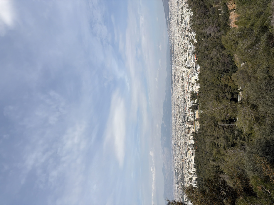 The image presents an expansive panoramic view of a densely populated city in Unknown, Greece, observed from an elevated position. The foreground is dominated by a thick canopy of dark green evergreen trees and other varied foliage, obscuring the ground directly beneath. Beyond this forested area, the midground reveals a sprawling urban landscape composed of countless tightly packed, light-colored, multi-story buildings that extend continuously across the frame. In the distant background, a range of mountains stretches horizontally, appearing muted and somewhat hazy against the sky. The upper portion of the image displays a light blue sky with scattered white, wispy clouds. The scene is illuminated by natural daylight. No individuals, specific vehicles, or discernible human activity are present.