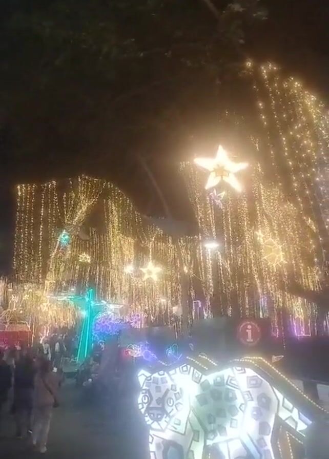 The video captures a vibrant nighttime scene of a public area decorated with an array of festive lights. The trees above are draped with strings of twinkling golden lights, forming a canopy overhead. Among the hanging lights are several illuminated stars. In the foreground, there is a large, geometric sculpture of a jaguar, lit with white and green lights. People are walking through the area, enjoying the display. The lighting is the primary element drawing attention.