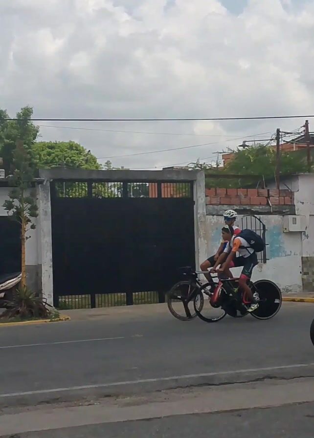 The video depicts three individuals cycling on a street in a town. Two individuals are riding what appear to be racing bicycles. The first racing bicycle has a rider, and a second individual is riding on the back of the bicycle. The second racing bicycle is ridden by one individual. The third bicycle is being ridden by an older man. The buildings behind them are of variable quality. The sky is overcast.
