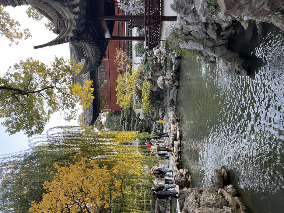 A pond surrounded by rocks features a line of people crossing over stones within the water. Above, a Chinese-style building with upturned eaves and intricate detailing overhangs the scene. A willow tree with bright yellow leaves droops gracefully over the water, partially obscuring the view. Additional trees with autumn foliage frame the upper part of the image. The sky appears overcast.