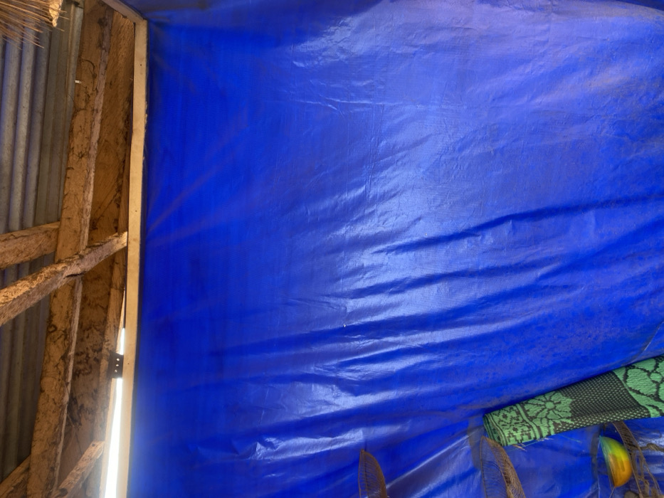 The image captures an interior view of a provisional structure located in the city of Okura, Nigeria. The primary visual element is a large, crinkled blue plastic tarpaulin, which forms the main wall, extending from the upper frame to the bottom and across most of the width. Above the blue tarp, a segment of the roof structure is visible, comprising multiple rough-hewn wooden beams or rafters supporting a corrugated metal sheet roof. A gap between the top edge of the tarp and a horizontal wooden beam allows some ambient light to penetrate. In the upper right corner, a small amount of dried organic material, possibly thatch or leaves, is partially visible. In the lower left quadrant, several objects are present against the blue tarp. Multiple light brown, coarse, net-like or woven items are partially visible, suggesting storage or hanging implements. Below these, a piece of green fabric or a mat, patterned with black floral or geometric designs, leans vertically against the blue tarp. Adjacent to the bottom-most woven item and the green mat, a small, multi-colored bowl, exhibiting a gradient from yellow to orange, is resting. No individuals or active interactions are depicted in the scene.