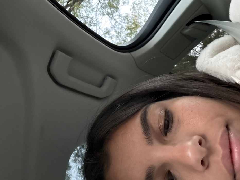 An individual is seated within the passenger compartment of a vehicle in Lawrence Township, United States. The lower half of a female's face, dark brown hair, and upper torso are visible, positioned towards the left and center of the frame. She has a medium-dark skin tone and her eyes are cast downwards and slightly to the right. A white, possibly faux fur, garment covers her right shoulder and chest area, and a silver-colored seatbelt buckle and strap are visible on her lower right. The vehicle's interior features a light gray headliner and an overhead grab handle. Through the vehicle's side window, tree branches are visible against a light sky, indicating an outdoor, daylight environment.