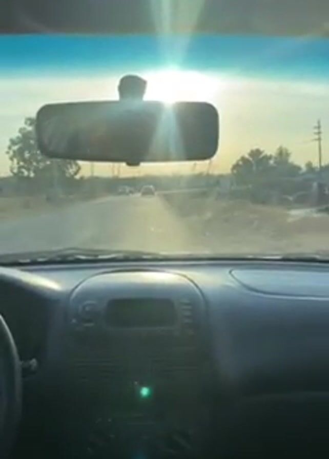 From the interior of a car, a driver’s perspective shows a road ahead with the sun shining directly towards the windshield. There are two other vehicles visible on the road, and utility poles line the road. The dashboard of the car is visible, and a hand briefly appears holding a pink object. The car horn is heard. The environment appears to be a rural area, possibly under construction.
