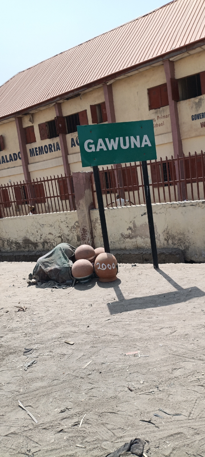 The image depicts an outdoor scene in the city of Gama, Nigeria. A light-colored building with a red corrugated metal roof, featuring multiple windows with reddish-brown shutters, occupies the background. Partial text on the building identifies it as "MALADO MEMORIA A[CADEMY/SCHOOL]" and a "V, Primary School", with "GOVERN[MENT]" also visible. In the midground, a green rectangular sign with the white capitalized text "GAWUNA" is mounted on two dark poles. Below the sign, on the dirt ground, a cluster of four terracotta-colored clay pots is visible; one pot in the foreground is marked with "2000" in white. Adjacent to the pots is a bundle of green fabric or tarp. The ground surface is composed of light-colored dirt or sand, showing tire tracks and scattered small debris. Strong sunlight casts distinct shadows from the sign poles and objects. No individuals or active interactions are visible.