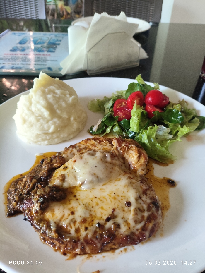An overhead shot displays a prepared meal on a white oval plate, resting on a glossy dark tabletop. The plate contains a substantial piece of cooked chicken breast, heavily topped with melted white cheese and a dark, textured sauce that appears to be herb or pesto-based. Accompanying the chicken are a mound of creamy mashed potatoes and a side salad consisting of green leaf lettuce and several halved red cherry tomatoes. In the blurred background, a transparent menu for "AGE SPORTS BAR & RESTAURANT," indicating its location near Arambol Beach, Arambol, India, is visible alongside a clear acrylic napkin dispenser holding white paper napkins. Wicker-patterned furniture is discernible in the extreme background. The image, captured by a POCO X6 5G device, is timestamped 06.02.2026 at 14:27.