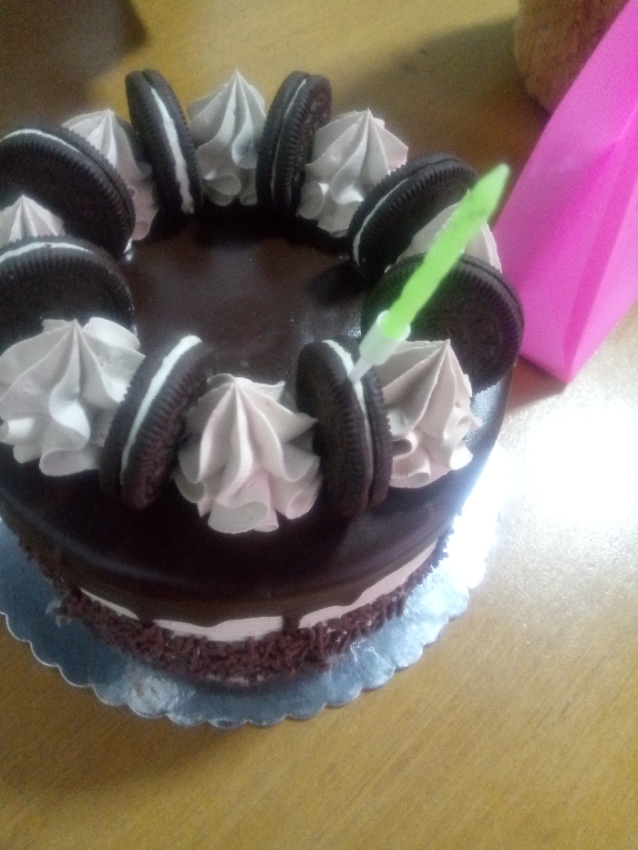 A chocolate frosted cake is decorated with dollops of gray icing and chocolate Oreo cookies arranged around the perimeter. A thin, green candle is inserted into the top. The bottom edge of the cake has a line of chocolate sprinkles. The cake sits on a decorative silver cake board on a wooden surface. A pink object is visible to the right of the cake.