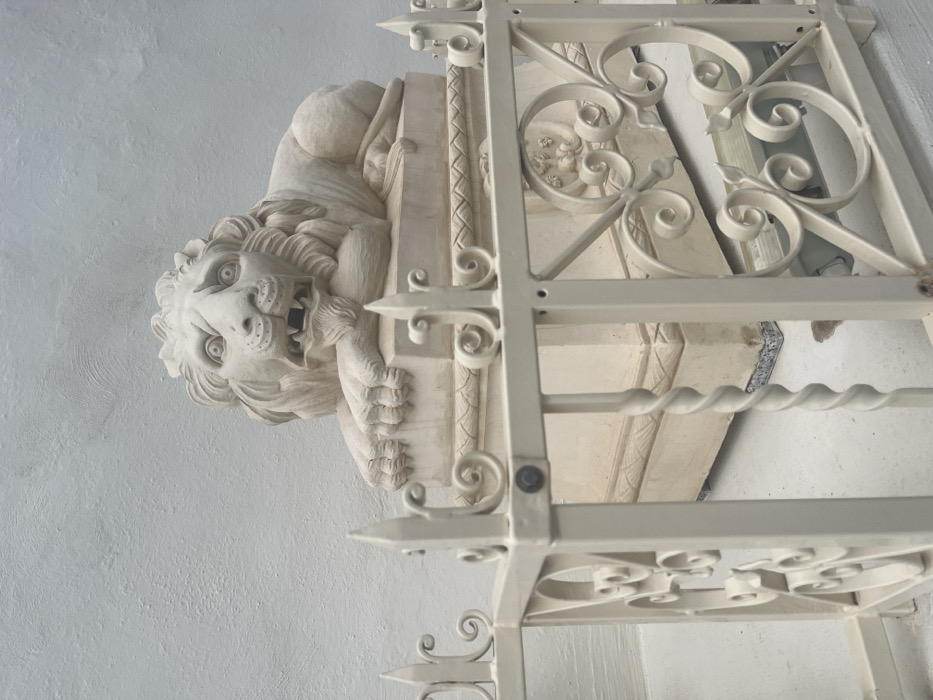 The scene depicts a light-colored, possibly stone or plaster, statue of a reclining lion situated against an off-white, textured wall. The lion statue faces forward, exhibiting an open mouth with visible teeth, wide eyes, and a detailed mane. Its front paws rest extended on a multi-tiered, ornate pedestal of a matching light color, which includes decorative moldings and a partial relief carving on its visible front face. In the immediate foreground, a light-colored, painted metal fence or railing partially obscures the lower portion of the lion's pedestal and the ground beneath. This fence features decorative elements including pointed finials, intricate scrolls, and twisted vertical bars. The ground visible through and beneath the fence is light-colored, possibly concrete, with a fragment of blue and white patterned tile discernible at the base of the pedestal. The scene is illuminated by ambient daylight. This location is identified as being within the city of Saint Paul's Bay, Malta.
