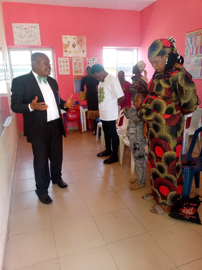 The image depicts an indoor scene in Television, Nigeria, where a group of individuals is gathered. The room features vibrant pink walls and light-colored tiled flooring. A large window on the left side allows natural light, revealing an exterior view. Educational posters are affixed to the back wall, including one welcoming "GRADES RADIANT," anatomical diagrams, and charts displaying numbers and shapes. In the foreground, an adult male on the left, dressed in a black suit, white shirt, and a green patterned bow tie, gestures with both hands, palms open, while looking towards the right. Facing him is another adult male wearing a white t-shirt with a green graphic and dark trousers, standing with his hands clasped behind his back and looking downwards. To his right, an adult female in a multi-colored patterned gown and matching head wrap stands with her hands clasped behind her back, also looking downwards. A young child, dressed in a grey patterned outfit, stands beside her, similarly looking downwards with hands clasped in front. A black tote bag rests on the floor near the woman's feet. Several other adults are visible in the background, standing and appearing attentive, some with head coverings. Scattered red and white plastic chairs are partially visible in the background. The overall scene suggests a formal gathering, possibly an educational or community event, with the man on the left appearing to address the group.