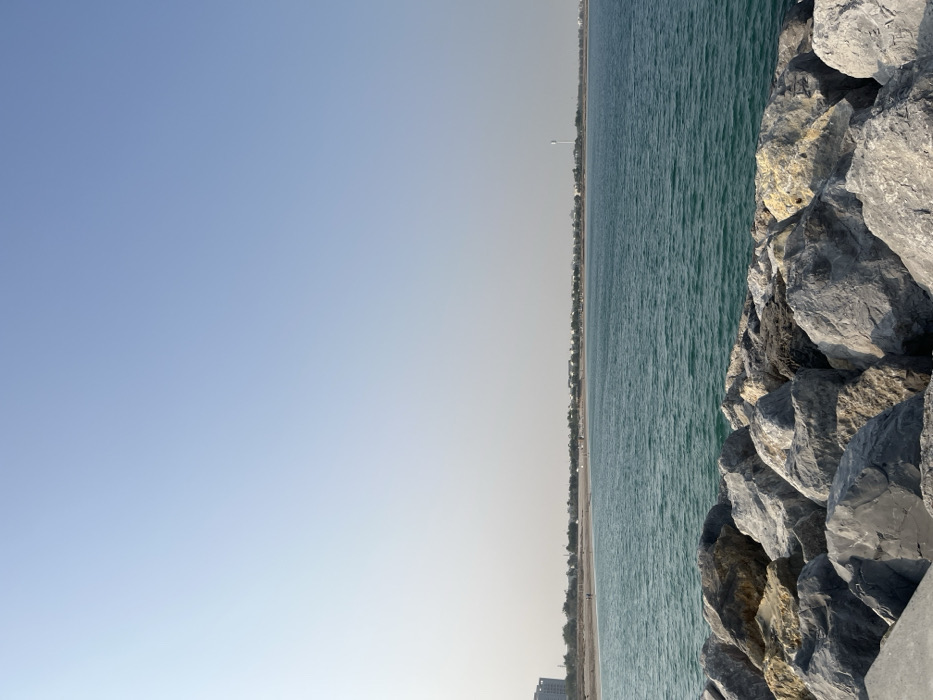 The image showcases a coastal landscape with a clear blue sky dominating the left side, gradually transitioning into a lighter hue near the horizon. To the right, the sea stretches towards the horizon, its surface textured with subtle ripples. A narrow strip of beach is visible along the coastline, dotted with hints of vegetation and buildings. Large, jagged rocks occupy the foreground on the right, their surfaces displaying varying shades of gray and hints of yellow.