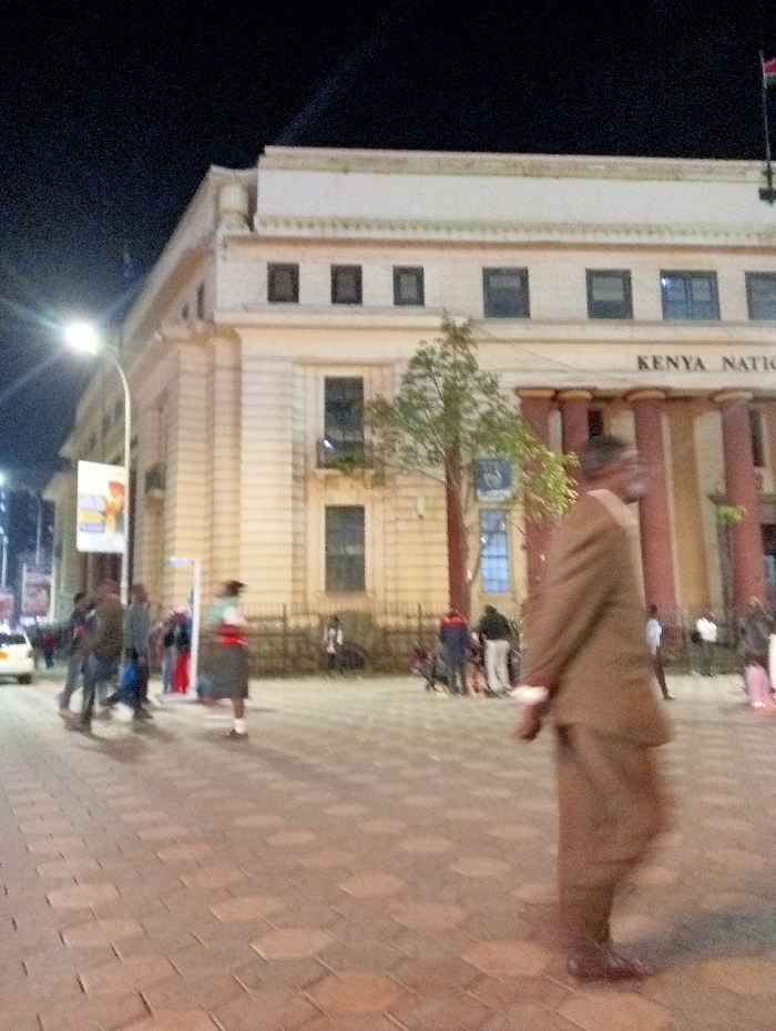 The image depicts a nighttime scene in the Central Business District of Nairobi, Kenya, specifically in front of the Kenya National Archives building