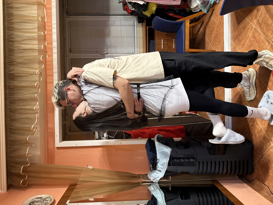 An indoor scene depicts a male and a female in a close embrace, kissing. The male, with bleached blonde hair, eyeglasses, and a left ear piercing, wears a light-colored short-sleeved t-shirt, dark pants, and white chunky sneakers. Tattoos are visible on his forearms. The female, with long dark hair, wears a light-colored tunic with a sheer black overlay and a thin black belt, black leggings, white socks with a Nike logo, and white furry slippers; her right foot is elevated and rests on the male's right foot. Their eyes are closed, and arms are wrapped around each other. The room has orange-peach colored walls and a terra cotta-colored tiled floor. A light brown ruffled curtain valance hangs above a window fitted with white blinds. To the left, a large mirror reflects a black speaker, a light blue towel, a dark blue bag, and cables. To the right, a wooden two-drawer cabinet and a blue chair are visible, with various clothing items draped or hanging in the background. A decorative white plate with a dark illustration is mounted on the upper left wall. The specific location within Sofia, Bulgaria, is not identifiable from the visual evidence provided.