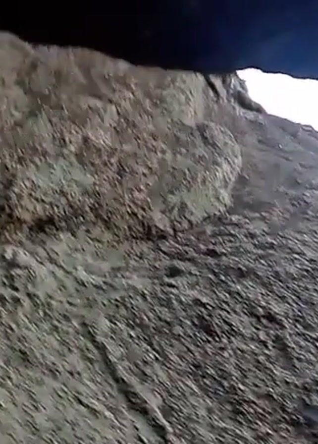 The camera pans upwards to show a large, rough, gray rock formation with crevices and textures