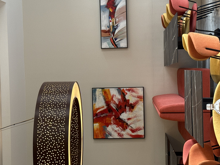 Two abstract paintings adorn a light beige wall. The top one is vertically oriented, while the lower one is square. To the left, a large, brown, circular lamp with small holes provides a source of light. To the right, a whimsical furniture arrangement features a stacked set of colorful chair seats and backs, appearing more like an art installation than a practical seating arrangement.